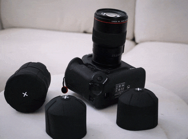 フロントとリヤ、両側から1個ずつ利用して全体を包み込めるサイズのレンズであれば、レンズにピッタリとくっつく様にフィットします。伸縮性の高いシリコン素材がレンズの内側を密閉状態に保ち、水やホコリが侵入する隙間を閉じてくれます。衝撃吸収も実験では腰の高さ(1m)程度では傷はつきません。