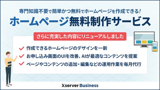 エックスサーバー株式会社(所在地:大阪市北区、代表取締役:小林 尚希)は2024年4月17日、法人向けサーバー「Xserverビジネス」で提供している「ホームページ無料制作サービス」をリニューアルしました。「ホームページ無料制作サービス」は、お客様からお送りいただいた情報をもとに、当社スタッフがホームページの制作を無料で代行するサービスです。今回のリニューアルでは、ホームページのデザインを一新したほか、掲載可能なコンテンツを新たに追加し、より充実した内容のホームページを作成できるようにしました。また、お申し込み画面のUI改善の実施に加え、制作後の運用代行も開始しています。