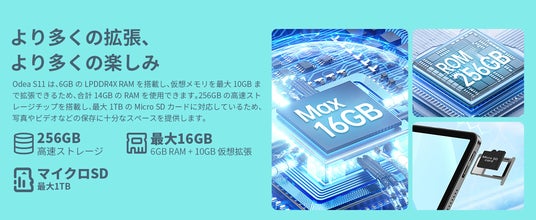 6GBのLPDDR4X RAMを搭載し、仮想メモリを最大10GBまで拡張できるため、合計14GBのRAMを使用できます。256GBの高速ストレージチップを搭載し、最大1TBのMicro SDカードに対応しているため、写真やビデオなどの保存に十分なスペースを提供します。