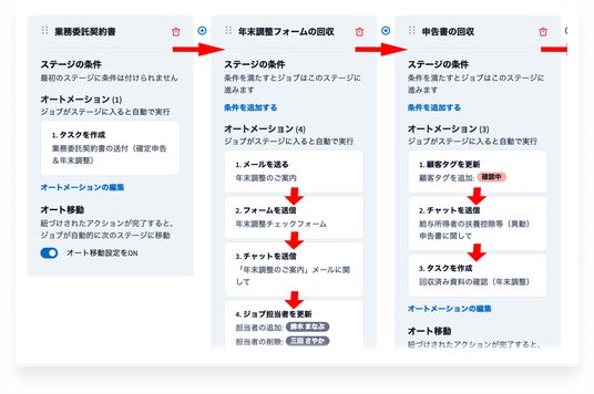 顧客へのチャットでの連絡、顧客からの資料の共有、顧客による料金の支払い、書類への電子サイン、事務所スタッフによるタスクの完了等、案件を構成するありとあらゆる要素を、オートメーションのトリガーとして設定することが可能。