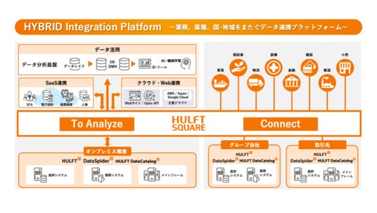 HULFT Squareは、DX実現に必要な「データ活用するためのデータ準備」や「業務システムをつなぐデータ連携」を支援する日本発iPaaS(クラウド型データ連携プラットフォーム)です。オンプレミス・クラウド・SaaSなどの環境に分散し管理されているさまざまなデータを、業務システム間、業種、国・地域をまたぎデータを連携させることができます。