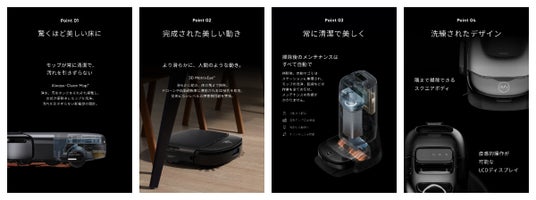 - 洗練されたデザイン:従来のロボット掃除機から感じられる生活感を払拭し、自宅のリビングにインテリアのように置いて人に“魅せたくなる”デザイン。製品本体は隅まで掃除できる美しい曲線を用いたスクエアボディを採用し、天面が凹凸のないフラットなため、家具やベッドの下まで入り込んで掃除が可能です。ステーションは視認性と操作性の高い液晶パネルを搭載しています。この機能性と美しさを両立する洗練された製品デザインにより、海外の複数のデザインアワードをしています。