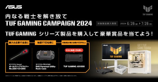 ASUS JAPAN株式会社は、ゲーミングシリーズのTUF GAMING製品を購入でもれなく「ASUS TUF GamingオリジナルVESSELドライバー」や抽選で「ASUS TUF GamingオリジナルPELICAN製ケース」などが当たる「TUF GAMING CAMPAIGN 2024 」を2024年6月28日(金)より開催します。
