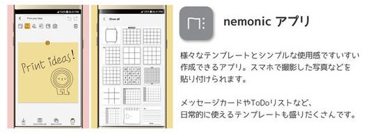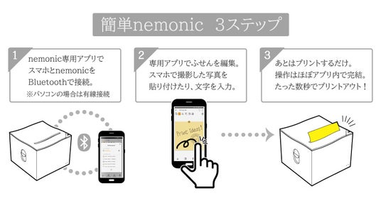 nemonicは革新的なふせんプリンターとして2017年に発売されました。スマートフォンやパソコンで入力した物がそのままふせんに印刷できるプリンターとして某公共放送や民放の人気TV番組でも紹介されるなど大好評でした。感熱式のプリンターなのでインクは要らず、プリンター本体と用紙カートリッジだけで印刷します。