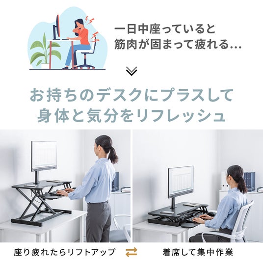 お持ちのデスクに置くだけで立ち仕事と座り仕事を簡単に切り替えることができます。作業スタイルを自由に切り替えることで、長時間の作業でも身体への負担を軽減します。