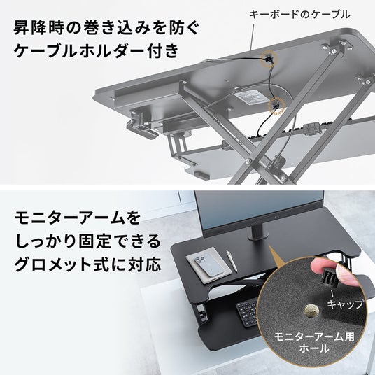 モニターアームをしっかり固定できるグロメット式に対応しており、デスク上のスペースを有効活用することができます。