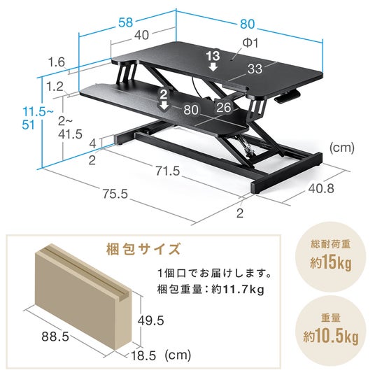 スタンディングデスク リフトアップデスク 卓上 ガス圧昇降 幅80cm モニターアーム取付対応 高さ調整11.5~51cm キーボード台 作業台
