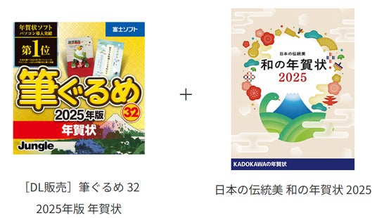 巳年限定素材を同梱した筆ぐるめ 32 2025年版 年賀状に、大人気のKADOKAWAの年賀状素材集『日本の伝統美 和の年賀状 2025』から厳選したレイアウトデータを収録したオリジナル版を発売。
