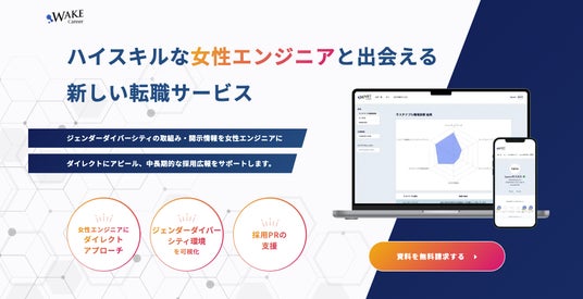 WAKE Career採用プラットフォームは、ハイスキルな女性エンジニアと出会える新しい転職サービスです。ジェンダーダイバーシティの取組み・開示情報を女性エンジニアへダイレクトにアピールし、中長期的な採用広報をサポートします。