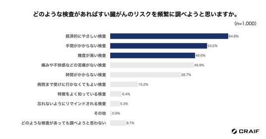 どのような特徴のある検査があれば、すい臓がんのリスクを頻繁に調べようと思うか尋ねたところ、「経済的にやさしい検査」が64.8%、「手間がかからない検査」が53.2%、「精度が高い検査」が46.6%と続きました。(n=1,000)
