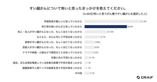 すい臓がんが怖いと思ったきっかけについて尋ねたところ、「死亡率の高いがんだと知っていたから」が38.9%と、第2位の理由として死亡率の高さが挙げられていました。約4割が死亡率が高いことについて認知していることがわかりました。(n=643/怖いと思うがん種ですい臓がんを選択した人)