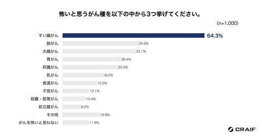 特に怖いと思うがん種を尋ねたところ、「すい臓がん」が64.3%と最も多く、「肺がん」が34.3%、「大腸がん」が33.1%と続き、多くの方が「すい臓がん」を特に怖いと感じていることがわかりました。(n=1,000)
