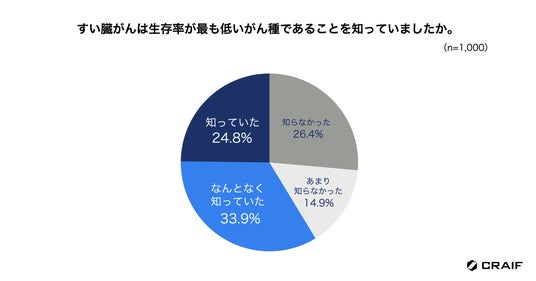 「すい臓がんは生存率が最も低いがん種であること」について尋ねたところ、「知っていた」「なんとなく知っていた」と回答した人が合わせて58.7%で、約6割の人がすい臓がんは生存率が低いことを認知しているとわかりました。(n=1,000)