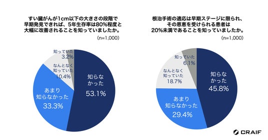 ◼️「すい臓がんがきわめて小さい段階で早期発見ができれば生存率が高いこと」「すい臓がんの根治手術の適応は早期ステージに限られること」について、約8割が知らなかった。