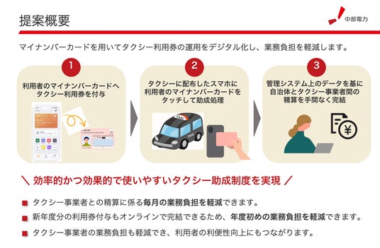 今後、当社と中部電力、中電クラビスは、マイナンバーカードの公的個人認証(JPKI)*機能を活用した当社のデジタル身分証アプリ「ポケットサイン」を用いて、スマートフォンで本人確認とタクシー利用券の付与を行い、町とタクシー事業者との間のデータ連携や精算までデジタル化する実証実験を町とともに実施する予定です。