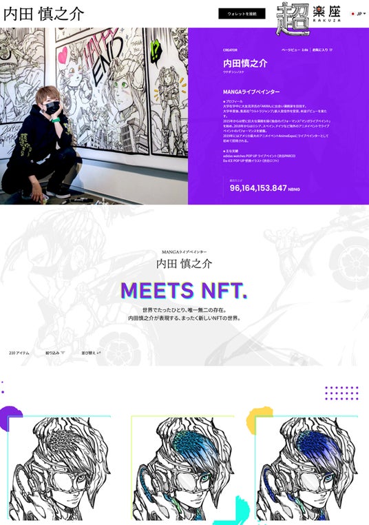 今回の新サービス「CREATORS’ 楽座」では、個人や法人を問わず、誰でも簡単にNFTショップを開設できるようになります。サービスでは、クリエイターは自身の作風や世界観を反映させたNFTショップを自由にデザインできます。そのため、クリエイターは、より効果的に作品の良さを伝えやすくなるだけでなく、購入者もクリエイターの世界観をより直感的に理解してNFTショッピングを楽しむことが可能になります。ショップ内では、デジタル・リアルを問わず、あらゆる作品を個別のECページのように直接リンクさせて出品することが可能です。