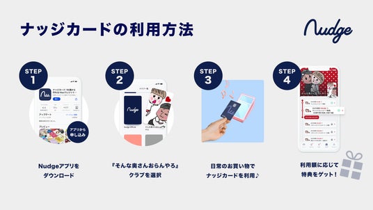 ユーザーは、ナッジカードアプリから「そんな奥さんおらんやろ」クラブ(※2)に入会し、日常のお買い物でナッジカードを利用することで、利用額の一部が「そんな奥さんおらんやろ」の活動支援に充てられます。