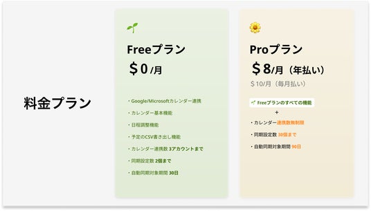今回登場したProプランでは、Freeプランのすべての機能に加えて、ビジネスにおける複数カレンダーの管理に役立つ機能が大幅にパワーアップしました。