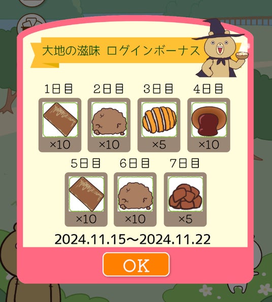 - 大地の滋味ログインボーナス:11/15 14:00 (金) - 11/22 14:00 (金)トンカツや牛カルビなど肉々しい具材がラインナップ!