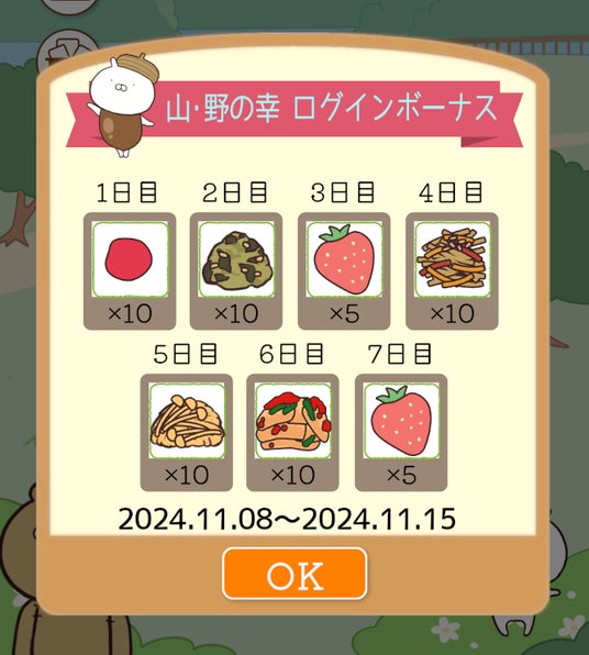 - 山・野の幸ログインボーナス:11/8 14:00 (金) - 11/15 14:00 (金)いちごやなめたけなどの山や野の幸の具材がラインナップ!