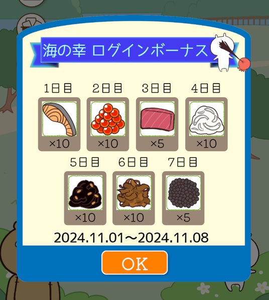 - 海の幸ログインボーナス:11/1 14:00 (金) - 11/8 14:00 (金)まぐろ、キャビアなど海の幸の具材がラインナップ!