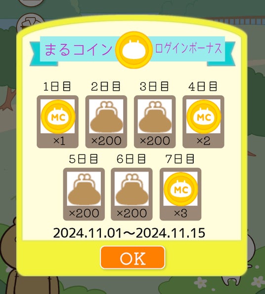 7日分のうち1日目、4日目、7日目にまるコインがゲットできるログインボーナスです!