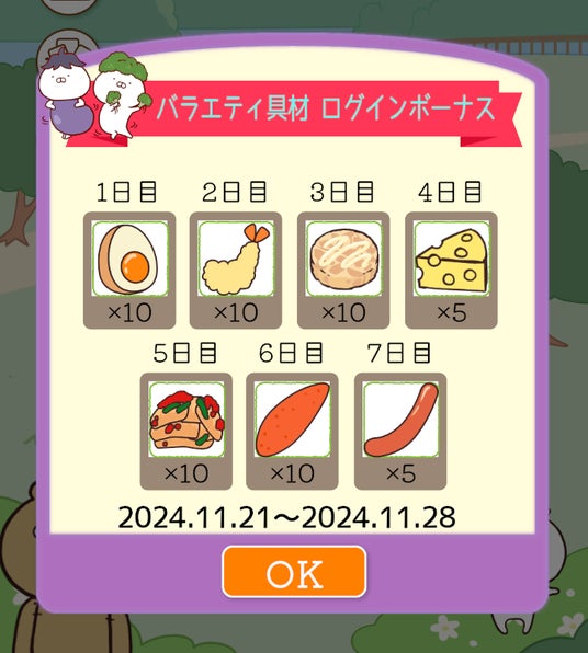 - バラエティ具材ログインボーナス:11/21 14:00 (木) - 11/28 14:00 (木)煮卵、チーズ、チリウィンナーなどバラエティに富んだ具材がラインナップ!
