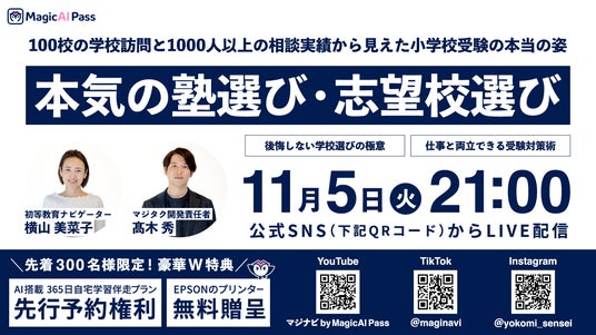 株式会社MagicAlPass(本社:東京都目黒区、代表取締役社長:高木 秀)は、2024年11月5日(火)21時スタート、完全無料の小学校受験応援メディア「マジナビ」より、編集長であり初等教育ナビゲーターの横山美菜子とAI搭載家庭学習習慣化プログラム「マジタク」の開発責任者高木秀による特別セミナーを開催いたします。本セミナーでは、これから小学校受験に挑戦するご家庭に向けて、実践的な塾選び・志望校選びのノウハウを提供いたします。