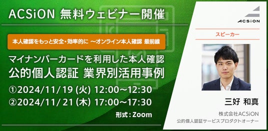 今回のウェビナーでは、最近の公的個人認証の活用事例をいくつかご紹介いたします。普及が進むマイナンバーカードを活用した本人活用事例を是非ご参考ください。また、今般、総務省から「公的個人認証法に基づくプラットフォーム事業者」に認定されたアクシオンが皆様に提供しているサービスについてもご案内いたします。普段、公的個人認証サービスを導入検討する際に企業様からよく質問されることや検討ポイントに挙がる内容も盛り込みお話しします。今後のご検討にむけて、是非この機会にご参加ください。