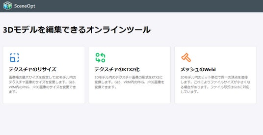SceneOptは、glbデータ形式の3Dデータのテクスチャのサイズ変更、KTX2化(Webでの最適なフォーマットへの変更)、メッシュの結合(weld)を自動で行う機能を備え、glbデータをメタバース等に公開するにあたって必要な処理を自動化するのに特化しています。