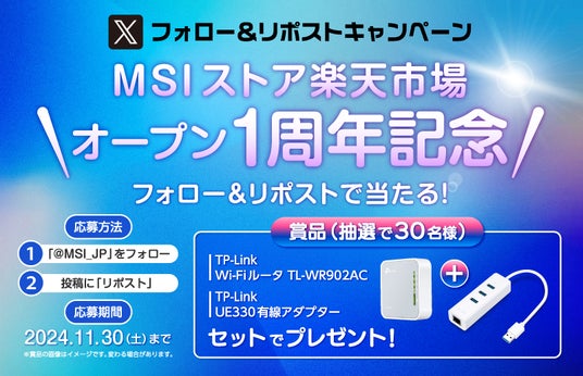 X(旧Twitter)のMSI公式アカウント(@MSI_JP 以下、MSIアカウント)をフォローしてキャンペーンポストをリポストすると抽選で30名様に豪華アイテムをプレゼント