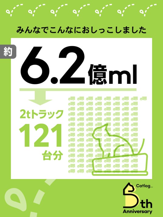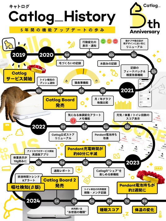 株式会社RABO(本社:東京都渋谷区、代表取締役社長:伊豫 愉芸子、以下「RABO」)の猫様の行動を24時間365日見守る首輪型デバイス『Catlog』は、すべての猫様と飼い主さんのおかげで今年5周年を迎えました。「世界中の猫様と飼い主さんが1秒でも長く一緒にいられるように。」と、はじまった『Catlog』ですが、この5年間、各種体調変化のアラートや、元気スコアの表示など様々なアップデートをおこない、多くの猫様を見守ってまいりました。そして、本日、そのなかで集まった160億件のデータ(2024年10月時点)のなかから、何億時間分寝たのかや、何億グラムうんちをしたのかなど、猫様にまつわるユニークな『Catlog』のデータおよび、RABOやCatlogの「データで振り返る5周年」を発表いたします。また、あわせて、地震からはじまった2024年にRABOだからできる取り組みの一環として、『Catlog』を着けた猫様が迷子になってしまった場合、半径約10m範囲の位置情報を地図で表示する「迷い猫モード」を新機能としてリリースすることをお知らせいたします。
