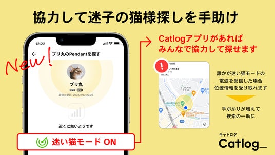 このような状況に対し、『Catlog』を着けた猫様が迷子になってしまった場合、半径約10m範囲の位置情報を地図で表示する「迷い猫モード」を新機能としてリリースすることといたしました。