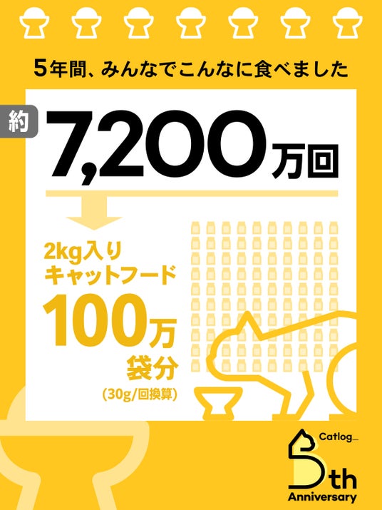 5年間、みんなでこんなに食べました7,200万回(2kg入りキャットフード100万袋分)