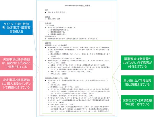 - 決定事項・議事要旨は、話されたトピックへの分割や、インデントを活用した構造化を行い、人にとっての可読性を向上させる