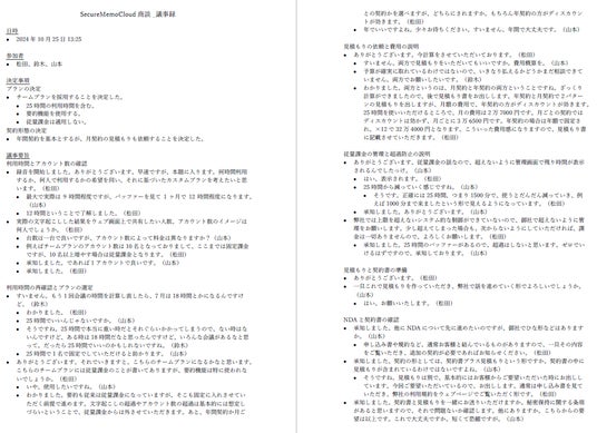 この機能をもって、SecureMemoCloudは「AI文字起こしツール」ではなく「AI議事録ツール」と称すことができる水準に達した、と考えています。