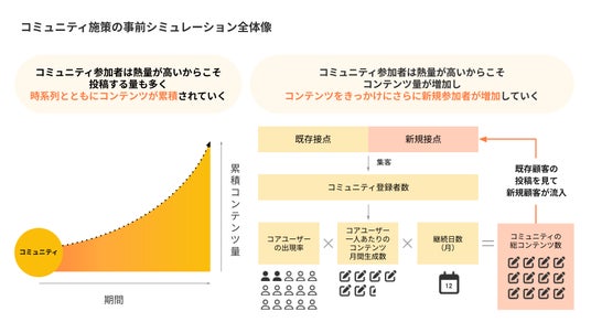 コミュニティの特性として、盛り上がりを醸成するまでに時間を要し、すぐに顧客理解のツールとして成果を挙げにくいことがあります。そうした懸念を解消するために、コミュニティ施策の事前シミュレーションを想定したシミュレーションシートをAsobicaと電通で共同で開発いたしました。シミュレーションによって、各社の保有接点に合わせて、集客の計画・見立てを立てることができます。