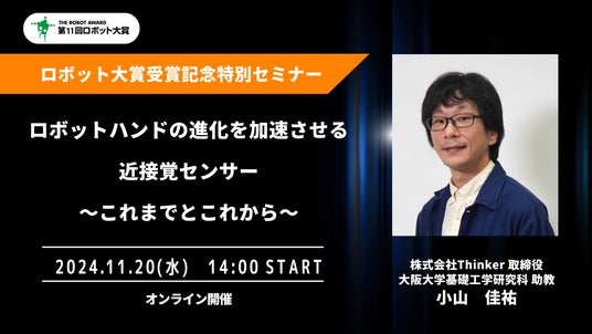 “指先で考えるロボットハンド”で製造現場の革新に取り組む株式会社Thinker(読み:シンカー、本社:大阪府大阪市、代表取締役兼CEO:藤本弘道、以下Thinker)は、近接覚センサーTK-01※1が第11回ロボット大賞※2で優秀賞(要素技術部門)を受賞したことを記念して、特別セミナーを開催いたします。