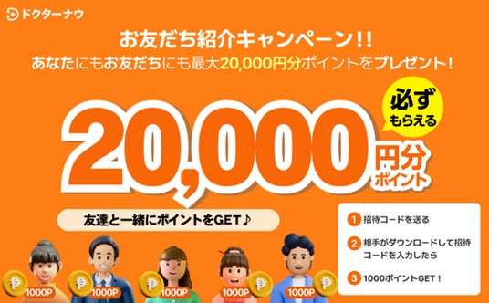 (2024年11月6日, 東京)日本国内「オンライン診療及び薬の配達サービス」分野で顧客満足度1位※を獲得しているドクターナウ(本社:東京都千代田区)は、友達を招待すると最大2万円相当のポイントがもらえるキャンペーンの開催を発表した。「ドクターナウ」アプリのユーザーが友達を招待すると1,000円相当のポイントが招待した側にもされた側にも付与され、ユーザーは最大2万円相当のポイントを受け取ることができる。友達と一緒に参加できるこのキャンペーンは、ドクターナウのサービスを負担を感じることなく体験できるようにサポートするための特別なキャンペーンになることが期待される。