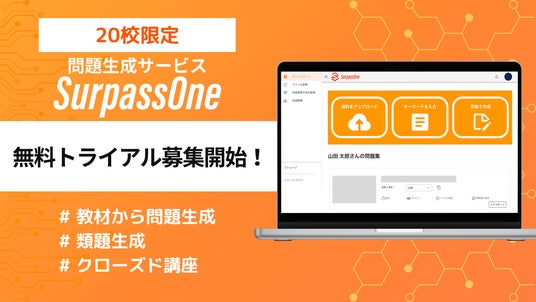学習サービス「SurpassOne」を運営するSurpassOne株式会社(東京都新宿区)は、全国の中学校・高等学校を対象にサービスの無料トライアルの提供を20校限定で開始いたします。問題の自動生成や類題生成などの革新的な機能に加え、この度、クラス単位での限定利用が可能な「クローズド講座」機能を新たに実装。ハルシネーション対策における当社の特許技術を用いて、教育現場でより安心してご活用いただける体制を整えました。