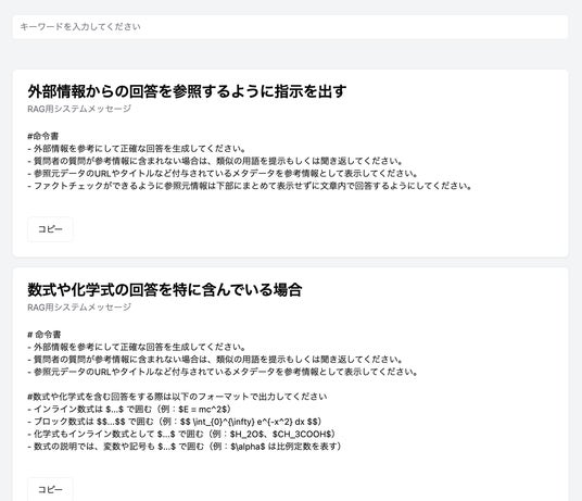 AskDona RAG用のシステムメッセージテンプレートは、目的や用途に合わせて最適なシステムテンプレートを選択できるように整理されています。AskDona RAGを導入後、すぐに最適化されたシステムメッセージを備えた状態のAskDona RAGを使い始めることができます。