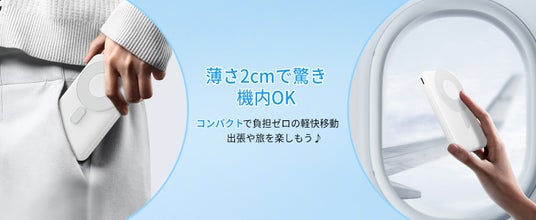 厚さわずか2cm、重さ203gの軽量設計で、カバンの中でも邪魔にならず、毎日の持ち運びが快適に。飛行機内への持ち込みも可能で、通勤や通学、旅行、アウトドアなど、あらゆるシーンで使いやすく設計されています。省スペースでありながら、充実した機能が詰まったバッテリーです。