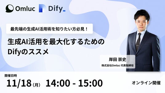株式会社Omlucは、生成AIアプリ開発プラットフォーム「Dify」を活用した業務効率化のポイントを具体的な事例とともに解説するウェビナーを開催します。生成AI活用の効果を最大化したい方は必見です。