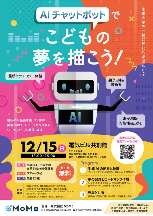 株式会社MoMo(本社:福岡県福岡市、代表取締役:伊藤翔)は、小学生を対象とした【福岡で無料AI体験!!】『AIチャットボットで こどもの夢を描こう!』~未来の夢を一緒に形にしませんか?~ を福岡市中央区で開催いたします。