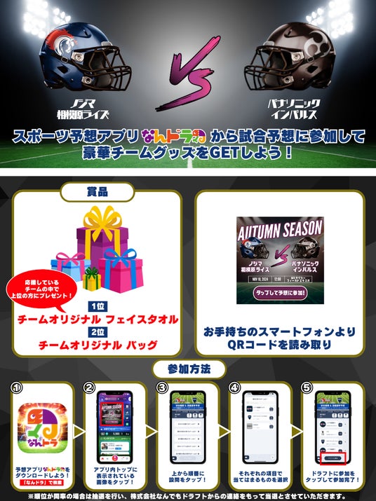 イノベーションの力で新たなスポーツ・エンターテインメントを創造し、まだ見ぬ感動と熱狂を提供するアプリ「なんドラ」を運営する株式会社なんでもドラフト(本社:東京渋谷区、代表:森井啓允)は、11月10日(日)にMKタクシーフィールドエキスポで開催される、Xリーグ 2024 秋季リーグ戦第6節 ノジマ相模原ライズ vs パナソニック インパルスの試合展開&活躍選手予想を開催します。