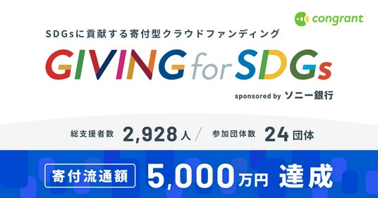 ソニー銀行とコングラントによる寄付型クラウドファンディング「GIVING for SDGs」が寄付流通額5,000万円を達成。