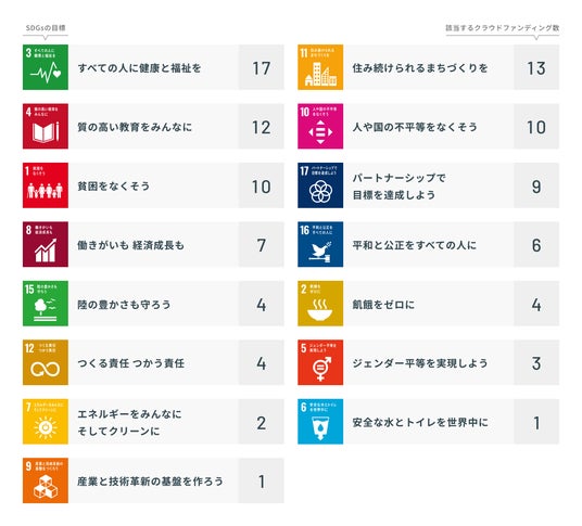 「GIVING for SDGs」では、団体様が挑戦するクラウドファンディングに該当するSDGsの目標を複数、回答いただいています。下記の様に、多くのSDGsの目標に寄与することができました。