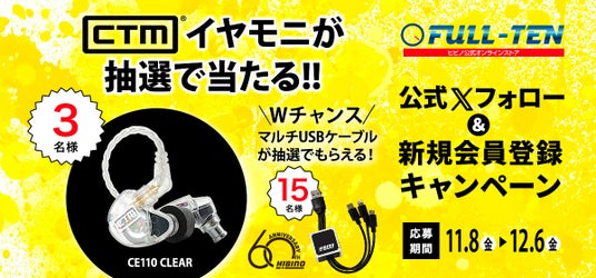 ヒビノ株式会社(本社:東京都港区、代表取締役社長:日比野晃久)EC事業推進部「FULL-TEN」は、2024年11月8日(金)から12月6日(金)の期間中、公式Xアカウント(@FULLTEN_hibino)のフォローとFULL-TENへの新規会員登録を応募条件としたプレゼントキャンペーンを開催します。ご応募いただいた方の中から、世界のプロから支持されるイヤホンブランド“CTM”による、高音質イヤーモニター「CE110 CLEAR」を抽選で3名様にプレゼント。また、Wチャンス賞品として「ヒビノ設立60周年記念品マルチUSB充電ケーブル」を抽選で15名様にプレゼントいたします。この機会にぜひ、音響機器の通販サイト「FULL-TEN」へご登録ください。