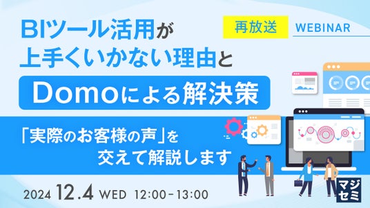 マジセミ株式会社は、大変好評をいただいた「【再放送】BIツール活用が上手くいかない理由と、Domoによる解決策」というテーマのウェビナーを再放送します。