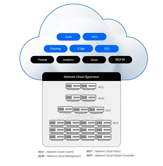 図: ドライブネッツ ネットワーク・クラウドの構成要素と対応済みユースケース(青)。ドライブネッツは PE (Provider Edge) ルーティングでの TIP 銅バッジの取得により、ディスアグリゲーション(分離型)ネットワーク環境におけるリーダーシップを強化。